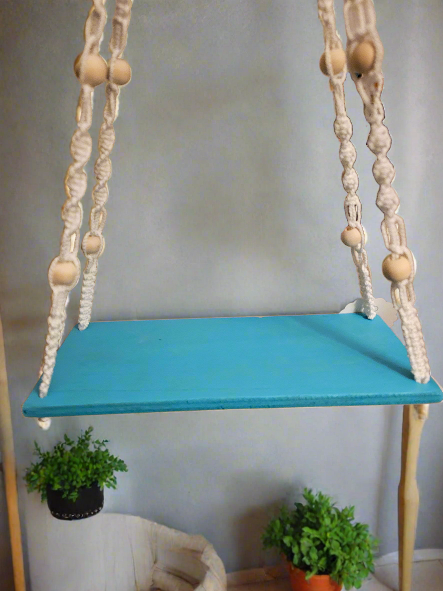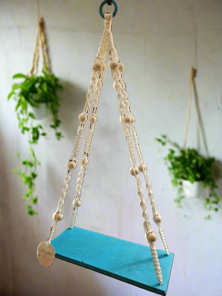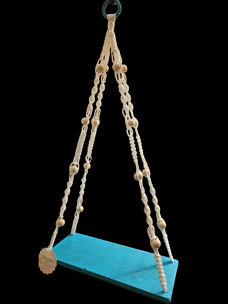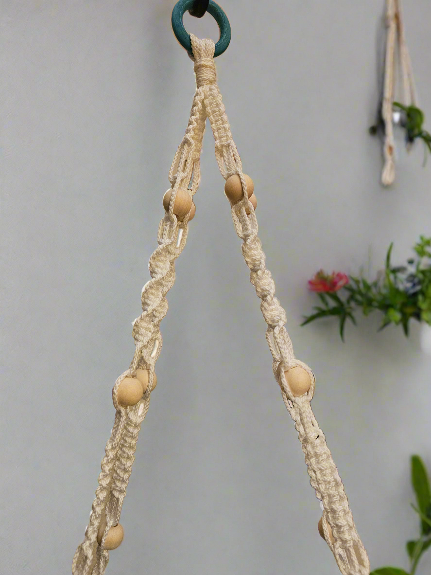 Handmade white macrame cord with light colored wooden beads. Teal wooden base.