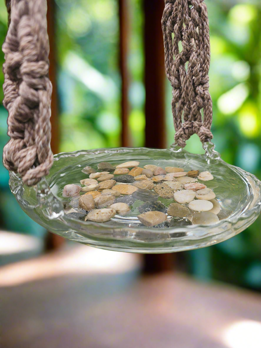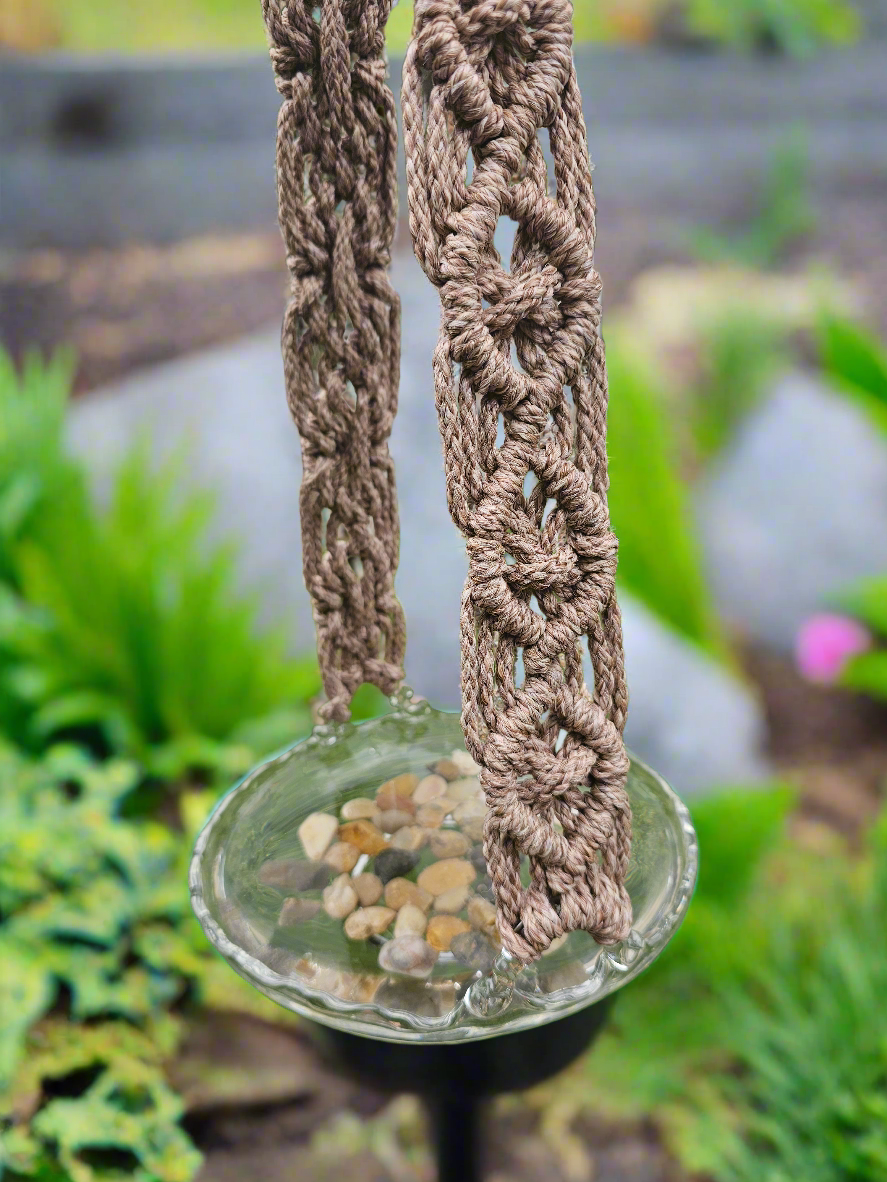 Handcrafted macrame bird bath. Brown macrame string with clear glass bowl.