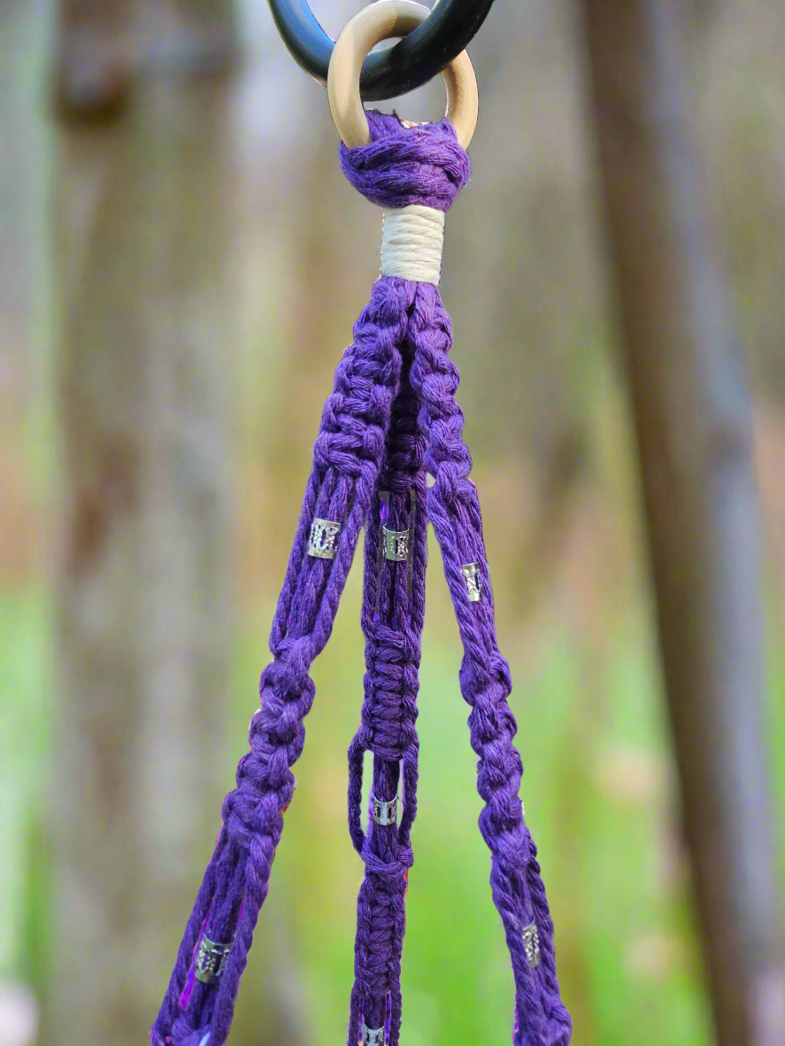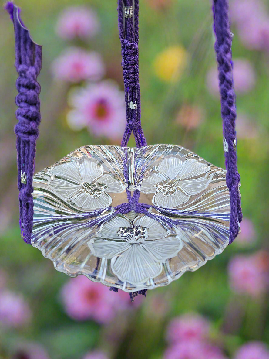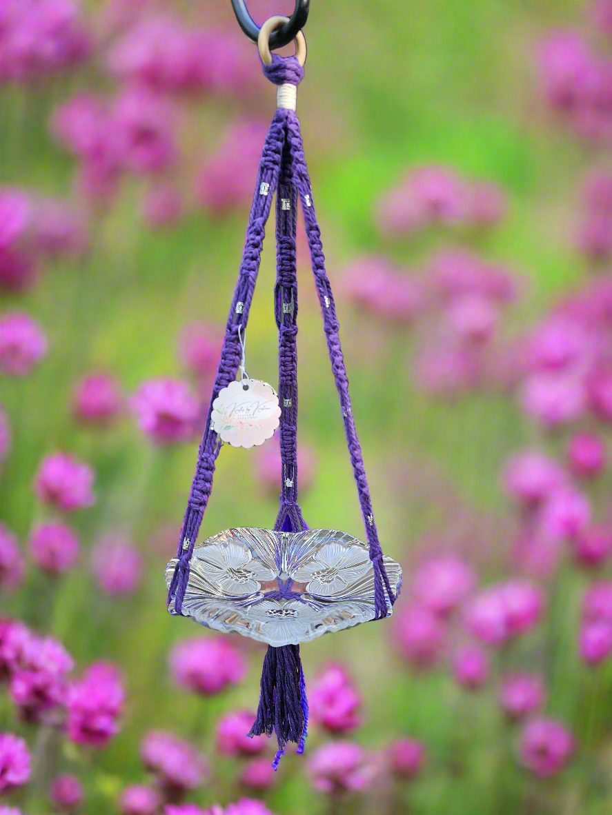 Handcrafted purple macrame string. Silver decorative beads. Crystal flower bowl. Great for bird feeder or plant hanger. Hangs 21 inches long without tail.