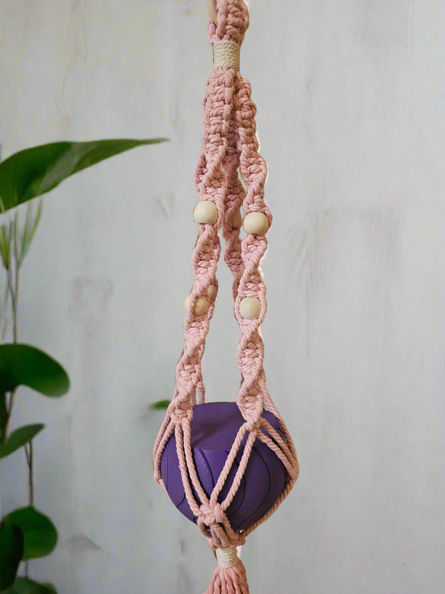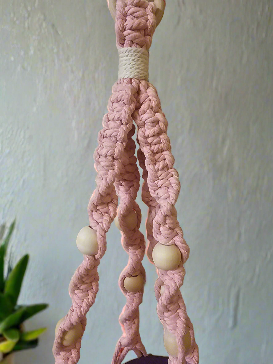 Handmade macrame plant hanger with pink string and wooden beads.