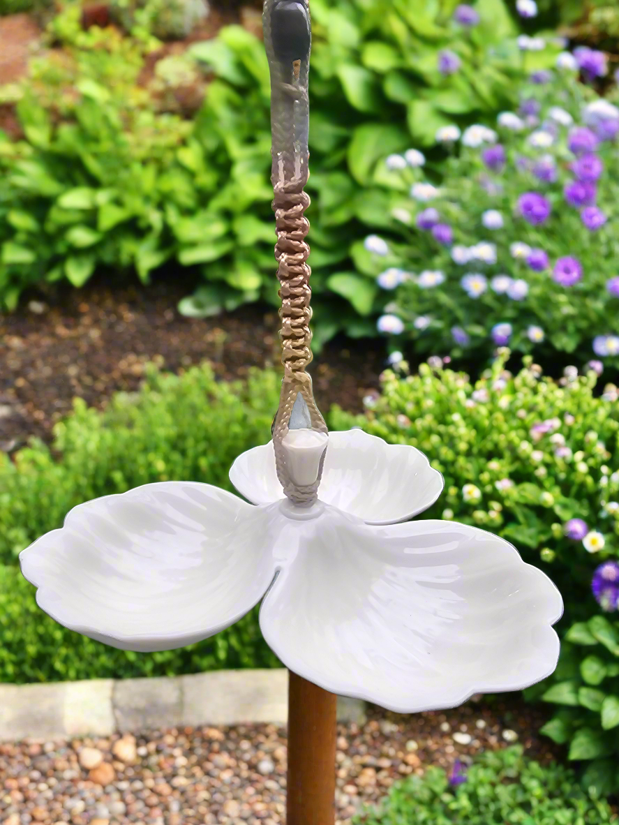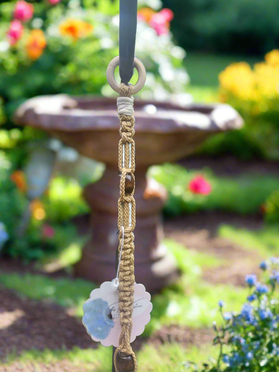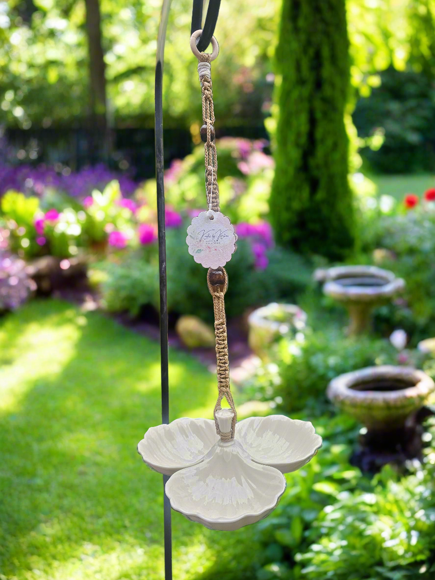 Hand crafted macrame hanger. Used for bird bath/ feeder or bee bath. Perfect in the garden. Brown string with brown beads, glass bowl.