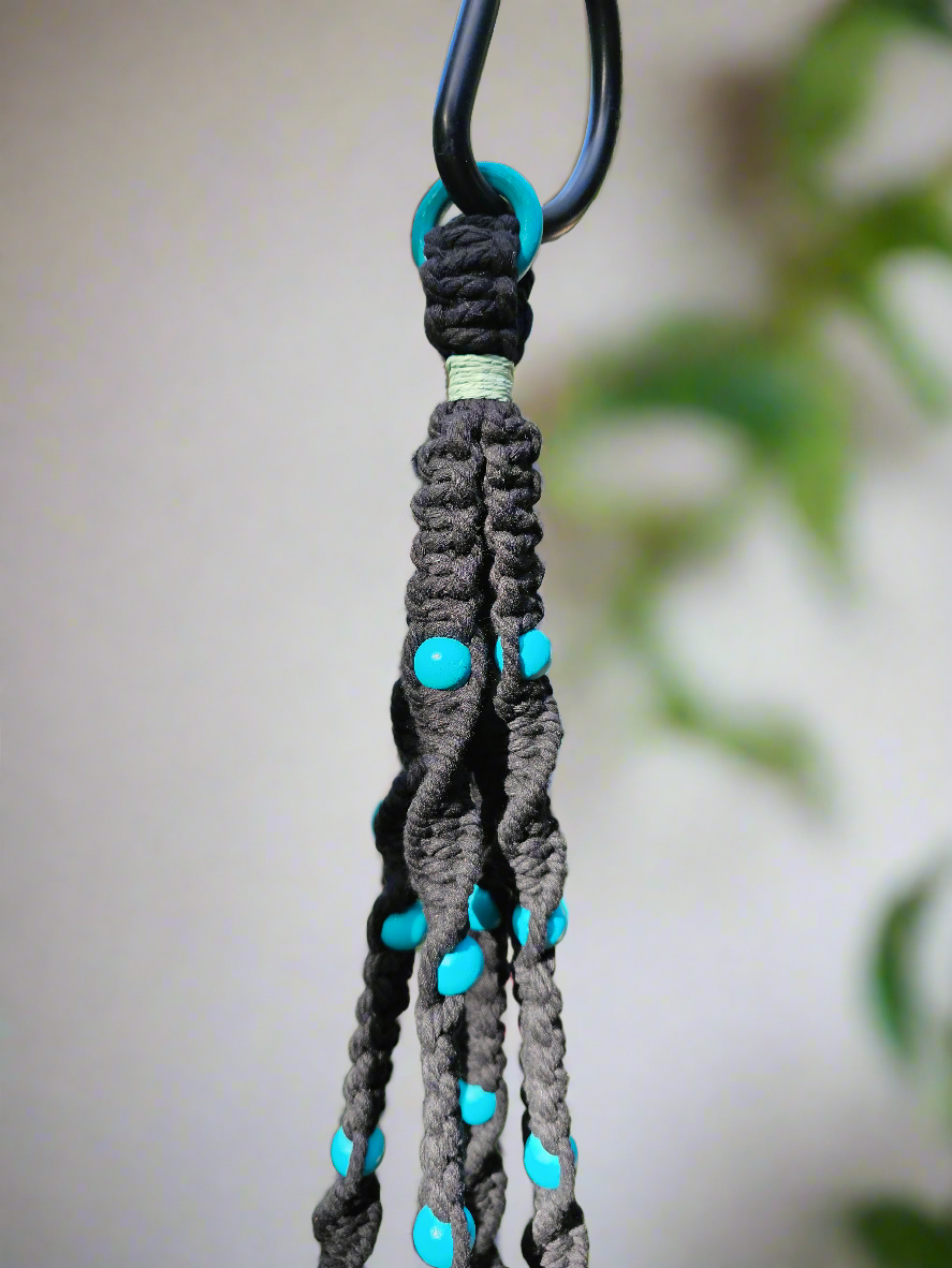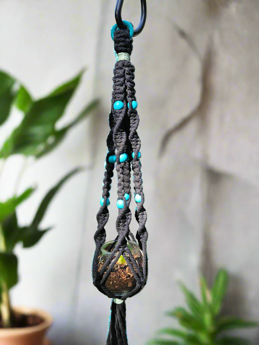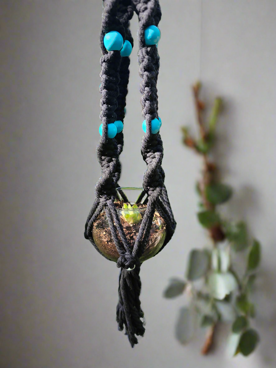 Handcrafted macrame plant hanger. Black macrame string with teal beads. Hangs 21 inches long without tail. Glass bowl with succulent.
